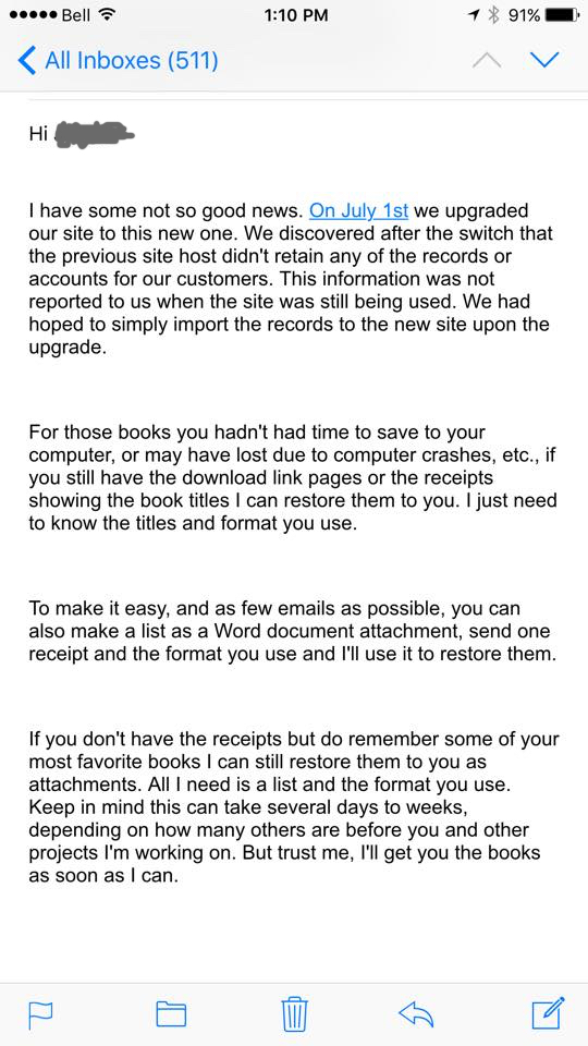 Another thing that I noticed. While a very nice EC Customer Service Rep is now working on sending me the files that I can remember that I lost, they are sending me those files as attachments that I then have to load into my reading app. They aren’t sending them to (or recreating) my customer library. That means if the site goes down again or there is another loss of data they might have to potentially do this all over again.